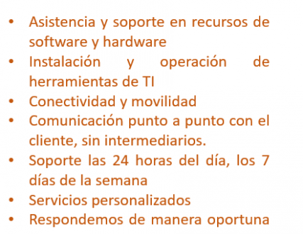 ¿Cómo puede ser MG Colombia un proceso de Apoyo para su Empresa?, este servicio consiste en la contratación externa de recursos anexos basados en la subcontratación de servicios que no afectan la actividad principal de la organización. Cuando las incidencias IT no logran ser resueltas por parte de sus colaboradores, MGE le brindará total cobertura e inmediata atención con un servicio de soporte en sitio especializado por días, meses y el tiempo que lo requiera. Con un equipo altamente capacitado, resolveremos cualquier inconveniente en problemáticas de TI.